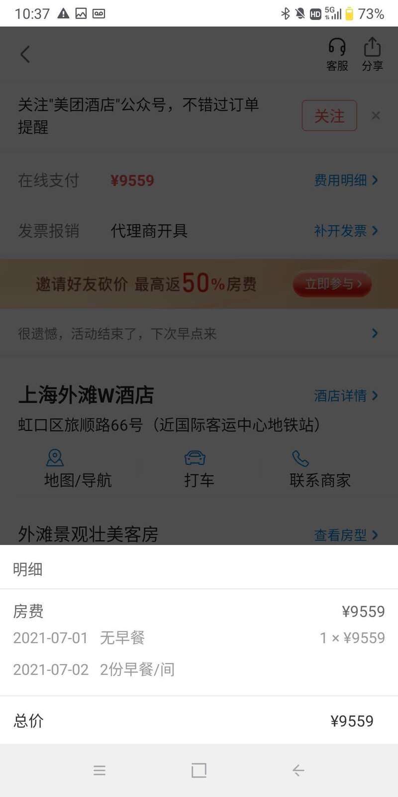 7月1日,带着娃前来上海旅游的俞先生(化名)在美团平台预订了一间当晚入住上海外滩W酒店一晚的客房,房型显示为46平方米的外滩景观壮美客房,价格9559元(人民币,下同)一晚。