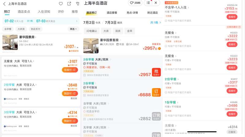 以7月2日入住上海半岛酒店、7月3日退房为例,上海半岛酒店官网微信小程序的不含早餐预订价格为3614.6元/晚,美团同房型不含早的价格为4314元/晚;携程平台已经售罄,但仍可看到价格和美团相同;去哪儿平台最便宜的价格为3107元/晚;飞猪平台的价格为2852元/晚,同程旅行平台的预订价格是3153.14元/晚。