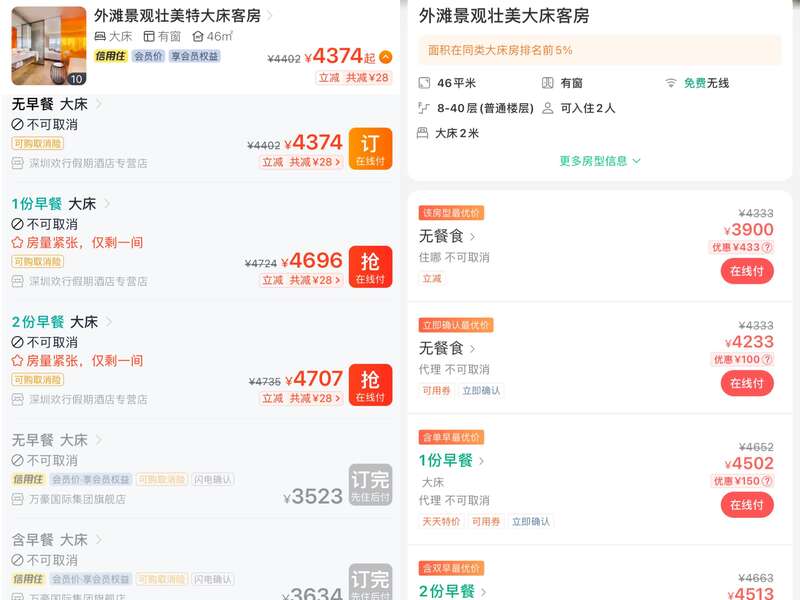 此外,在美团和飞猪还能看到该房型不含早有超过6000元/晚的价格,与前述价格均来自不同的代理。此外针对同一房型,1人入住与2人入住的价格也不相同。