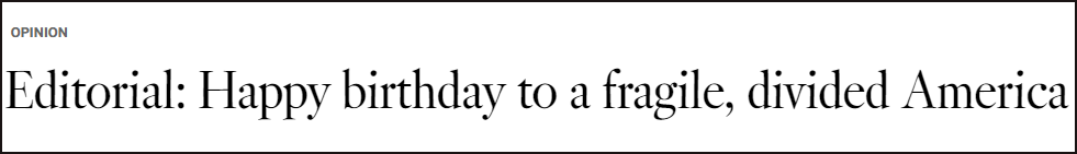 《洛杉矶时报》则更加直接,于4日凌晨发表社评,“祝脆弱、分裂的美国生日快乐”(Happy birthday to a fragile, divided America)。