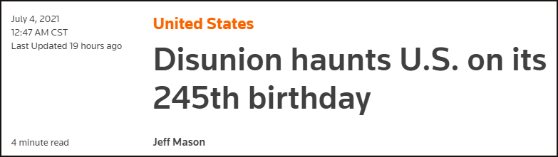 在美国“国庆”——独立日当天(7月4日),英国路透社发文称,“第245个生日,分裂依然盘亘在美国头上”(Disunion haunts U.S. on its 245th birthday)。
