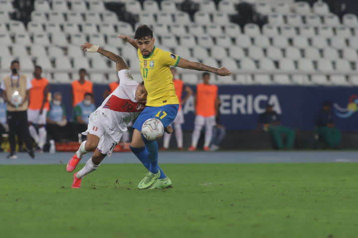 秘鲁队球员约希马尔·约顿(左)与巴西队球员卢卡斯·帕克塔拼抢。新华社发(拉赫尔·帕特拉索摄)