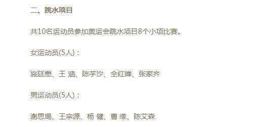 东京奥运会,中国跳水队共10名运动员参加跳水项目8个小项比赛,男女运动员各5名。