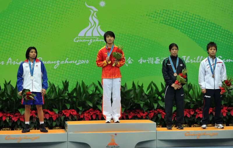 2010年11月25日,第16届亚运会拳击项目女子48-51公斤级颁奖仪式在佛山举行,中国选手任灿灿(左二)获得冠军,菲律宾选手安妮·阿尔瓦尼亚(左一)获得亚军,印度选手玛丽·科姆(右二)和日本选手新本亚也并列季军。新华社记者公磊摄