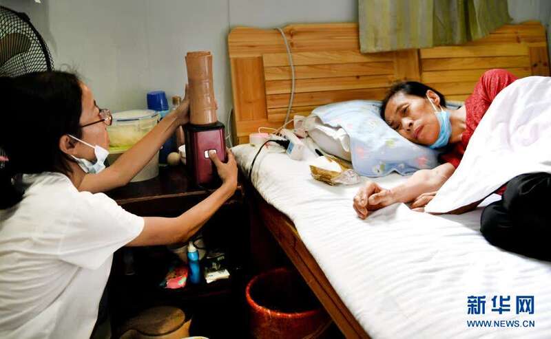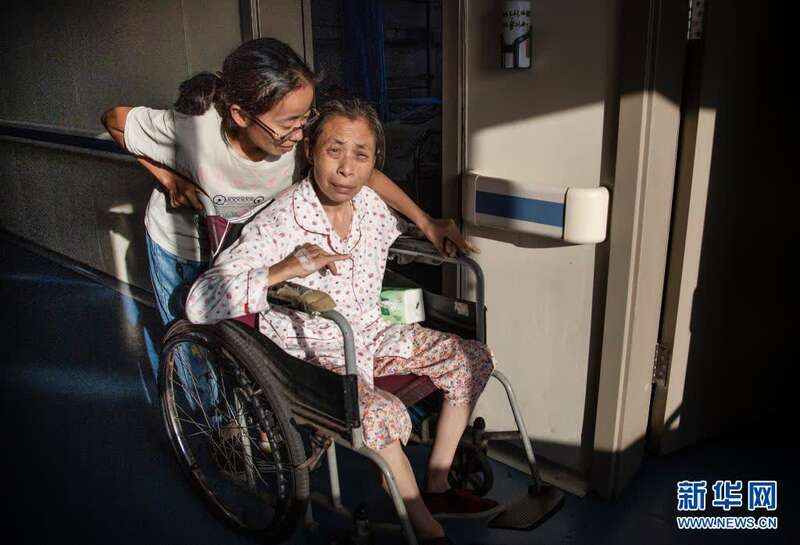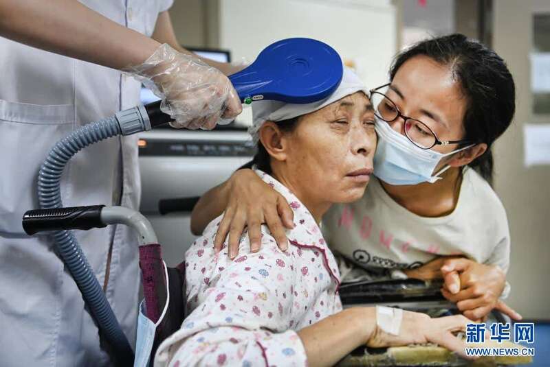 杨竹梅(右)脸贴着母亲的脸,安慰治疗中焦急不安的妈妈(6月22日摄)。新华社记者 陶明 摄