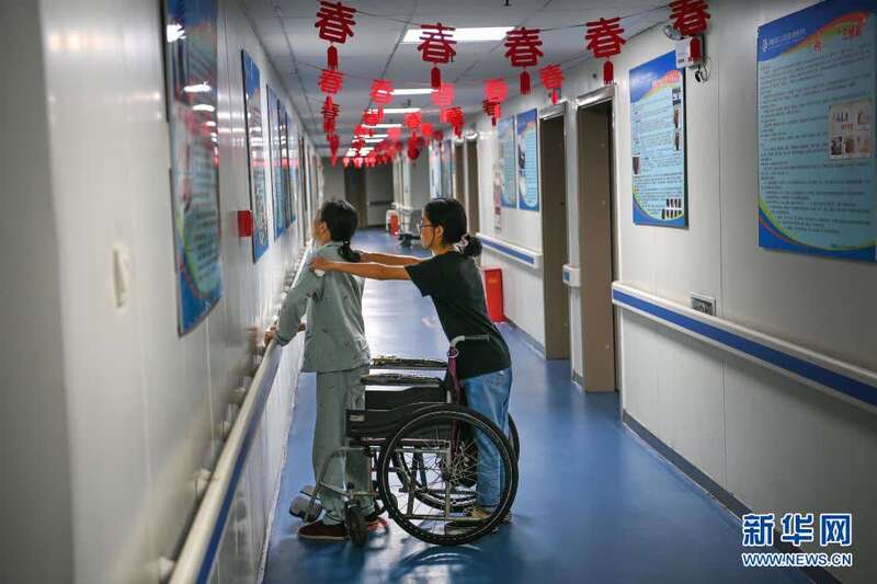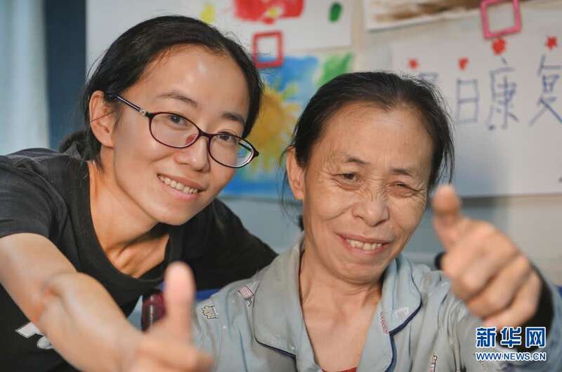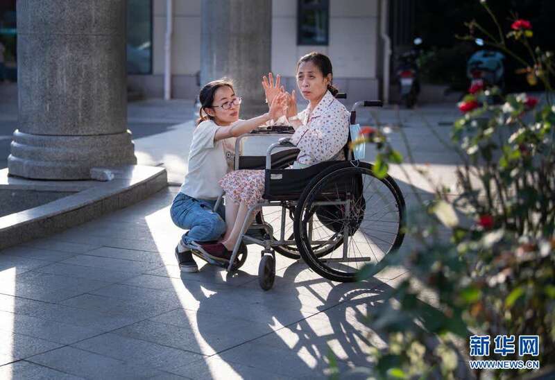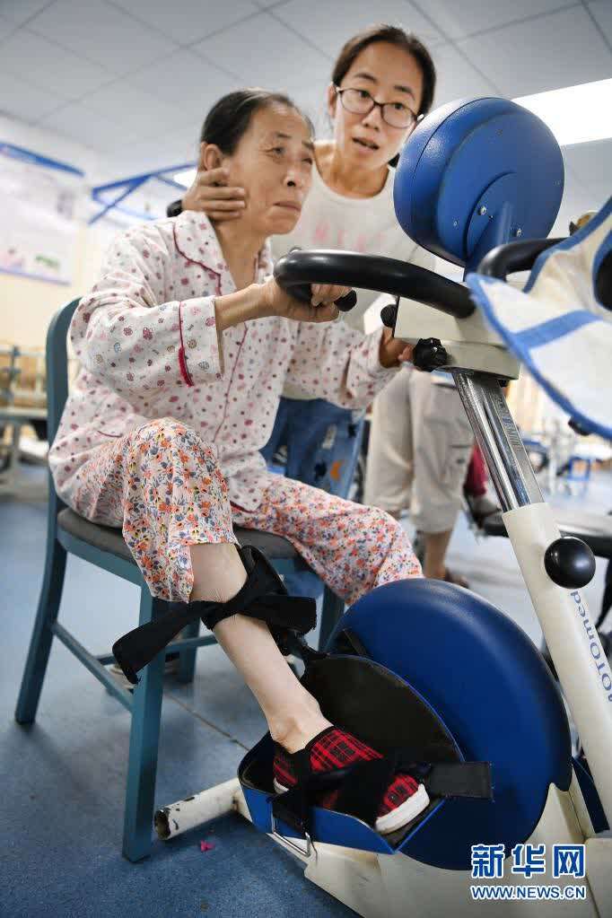 在医院的康复训练室里,杨竹梅(右)协助母亲训练(6月22日摄)。新华社记者 陶明 摄