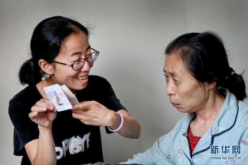 杨竹梅(左)帮母亲进行语言康复训练(6月23日摄)。新华社记者 陶明 摄