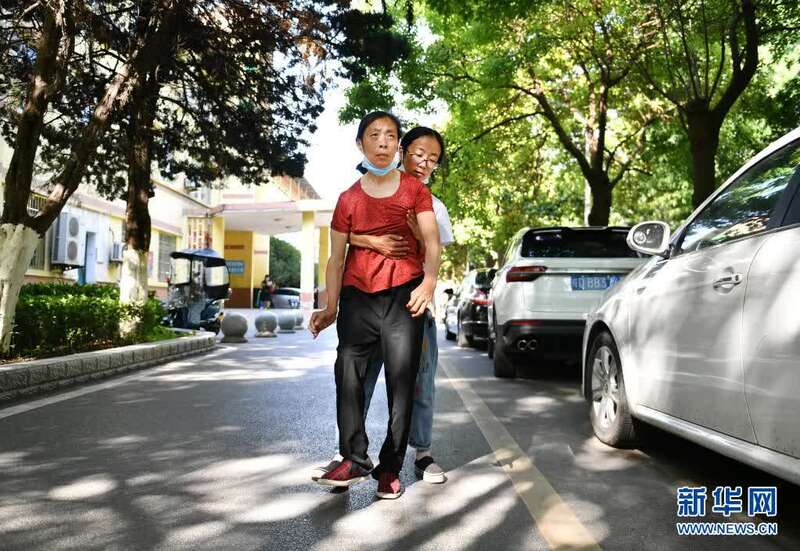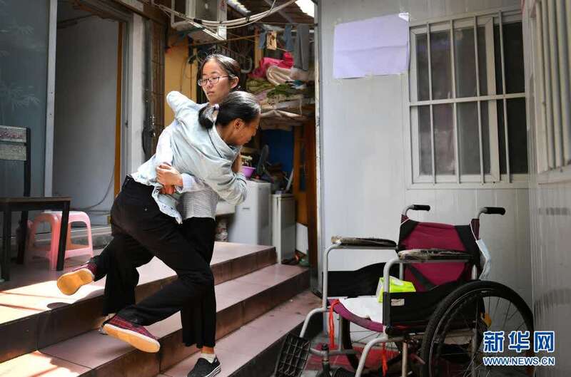 杨竹梅抱着母亲从出租房的台阶走下(6月8日摄)。新华社发(余康生 摄)