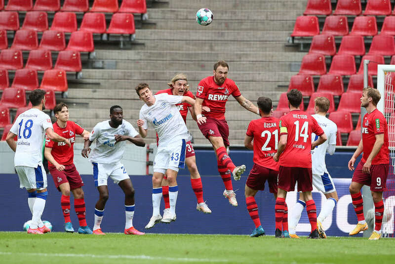 5月22日,在2020-2021赛季德国足球甲级联赛第34轮比赛中,科隆队主场以1比0战胜沙尔克04队。科隆队球员博尔瑙(左五)在比赛中争顶。新华社发(乌尔里希·胡夫纳格尔 摄)