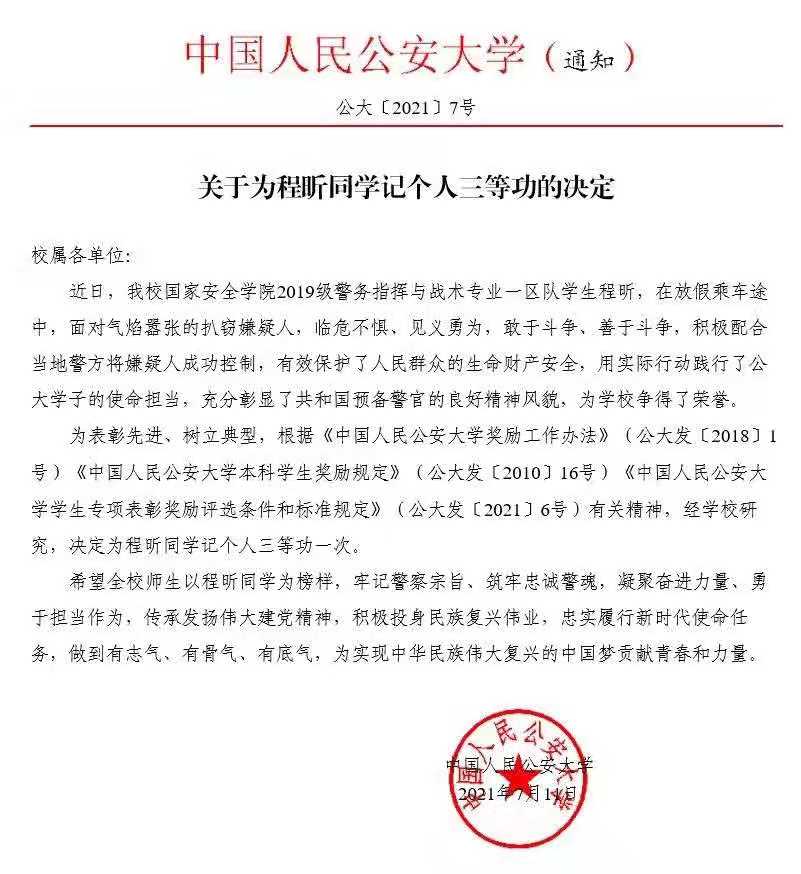 前述决定称,为表彰先进、弘扬正气、树立典型,7月11日,中国人民公安大学决定给予程昕同学记个人三等功。