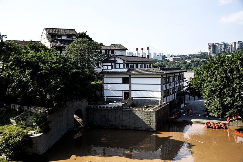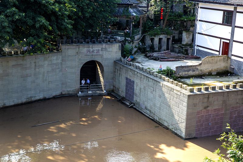 2021年7月12日,重庆嘉陵江1号洪水袭磁器口古镇,上涨的江水直逼清水门。