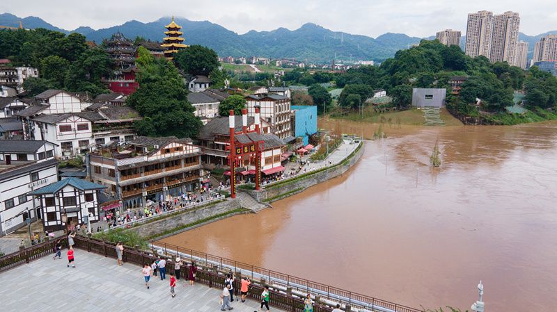 2021年7月12日,重庆沙坪坝区,市民围观磁器口洪水上涨。