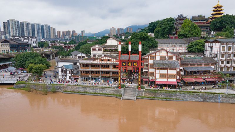 2021年7月12日,重庆嘉陵江1号洪水袭磁器口古镇,上涨的江水直逼磁器口码头,码头已禁止通行。