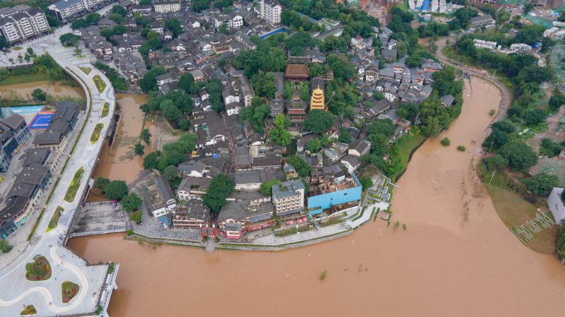 2021年7月12日,重庆,沙坪坝区磁器口码头广场已被完全淹没。