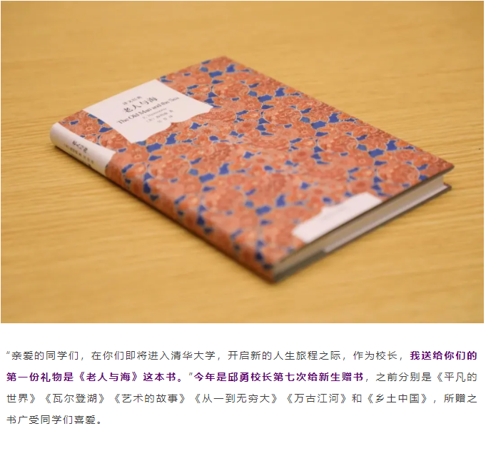 在你们即将进入清华大学,开启新的人生旅程之际,作为校长,我送给你们的第一份礼物是《老人与海》这本书。
