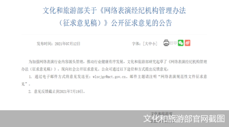为加强网络表演行业内容源头管理,推动行业健康有序发展,7月12日,文化和旅游部发布了《管理办法》,并向社会公开征求意见。