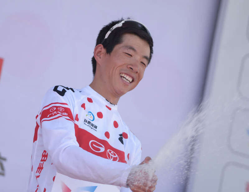 7月13日,长沙顺时针车队选手胡甜甜身着代表爬坡总积分第一名的圆点衫,在领奖台上喷洒香槟庆祝。新华社记者 张曼怡 摄