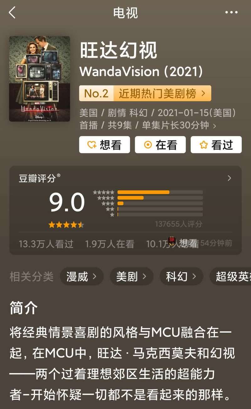 再加上《旺达幻视》是漫威疫情以来,与观众见面的第一部作品,满足了大家在过去将近一年半的时间里对漫威超英系列电影的渴望。毕竟,在此之前,漫威一直保持着一年2-3部作品与观众见面的节奏,而此次却因为疫情,一直没有新作品推出。