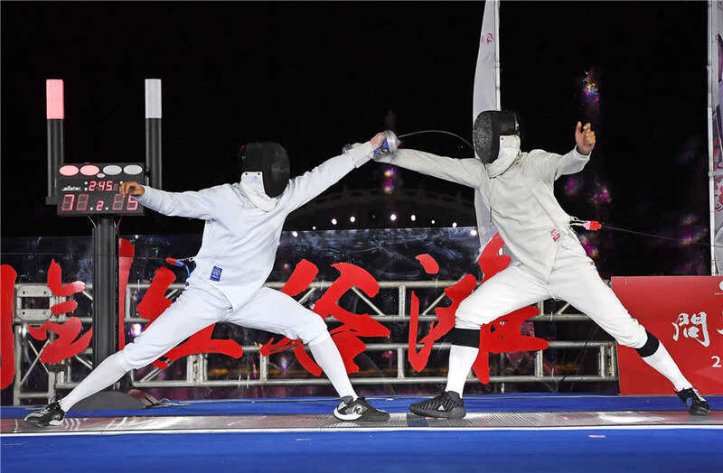 在南昌举行的2020中国击剑大师赛男子重剑决赛中,王子杰(左)对阵石高峰(2020年10月31日摄)。新华社记者 万象 摄