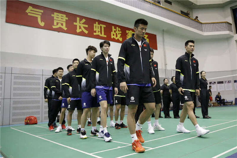 汤姆斯杯模拟赛在国家体育总局训练局羽毛球馆进行,谌龙(前)等参赛球员在赛前出场(2020年10月4日摄)。新华社记者 张晨 摄