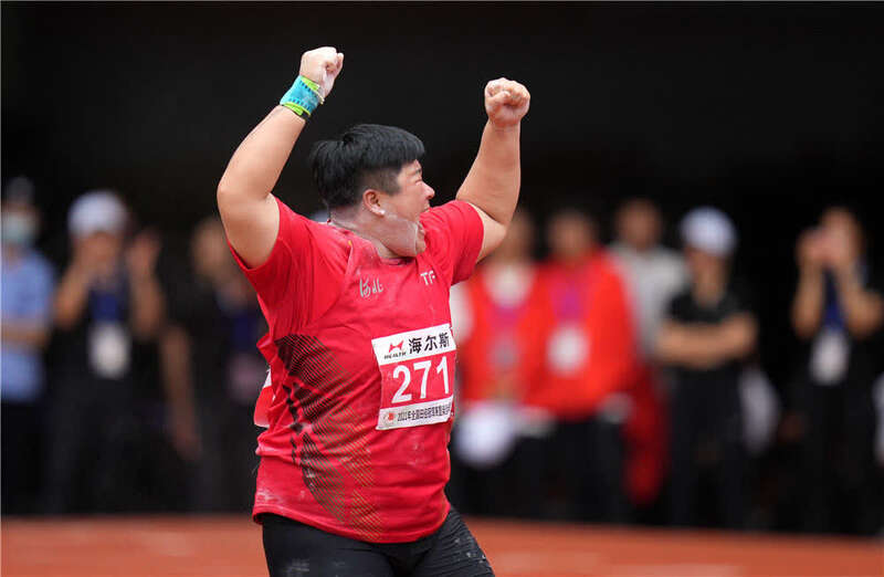 在浙江省绍兴市上虞体育场举行的2021年全国田径冠军赛暨奥运会选拔赛女子铅球决赛中,河北队选手巩立姣庆祝(2021年6月13日摄)。新华社记者 李一博 摄