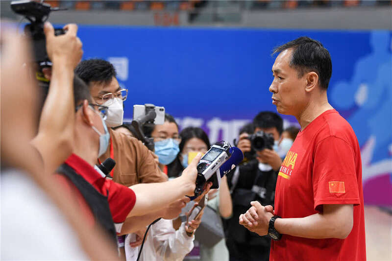 中国女篮在江苏苏州奥体中心体育馆举行公开训练课,主教练许利民(右一)在训练结束后接受采访(2021年7月9日摄)。新华社记者 李博 摄