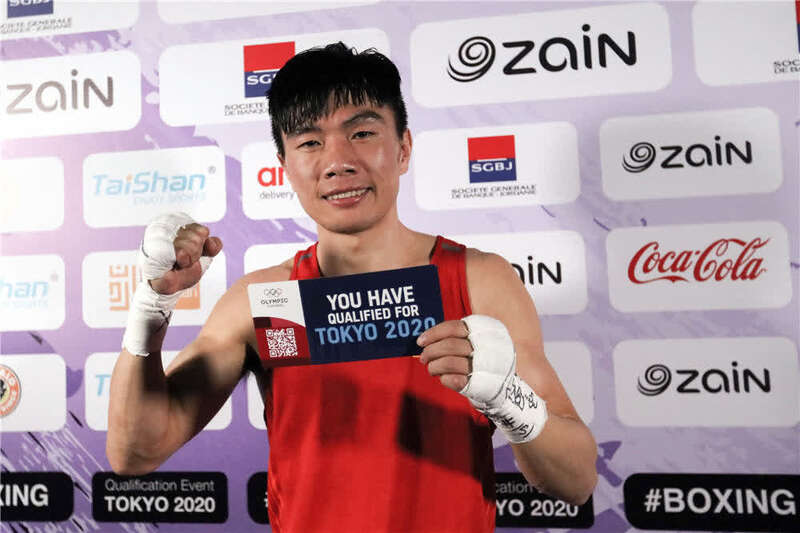 在约旦安曼举行的2020年东京奥运会拳击亚洲大洋洲区资格赛男子52公斤级四分之一决赛后,中国选手胡建关展示东京奥运会入场券(2020年3月9日摄)。新华社发(穆罕默德·阿布·古什摄)