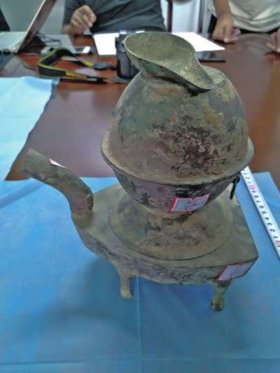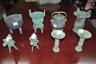 花觚、爵杯、青铜甗yǎn、提梁卣yǒu等八件(二级文物),不可分割。