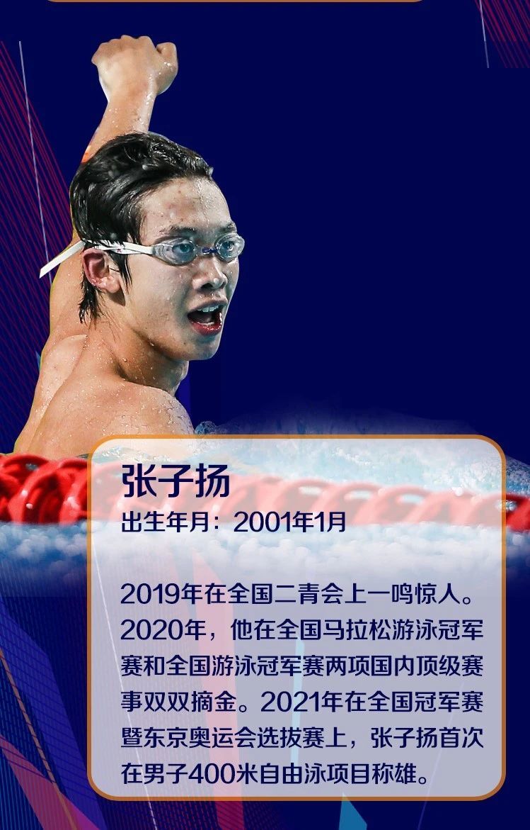 在本届东京奥运会中张子扬将参加男子4*200米自由泳接力项目比赛。