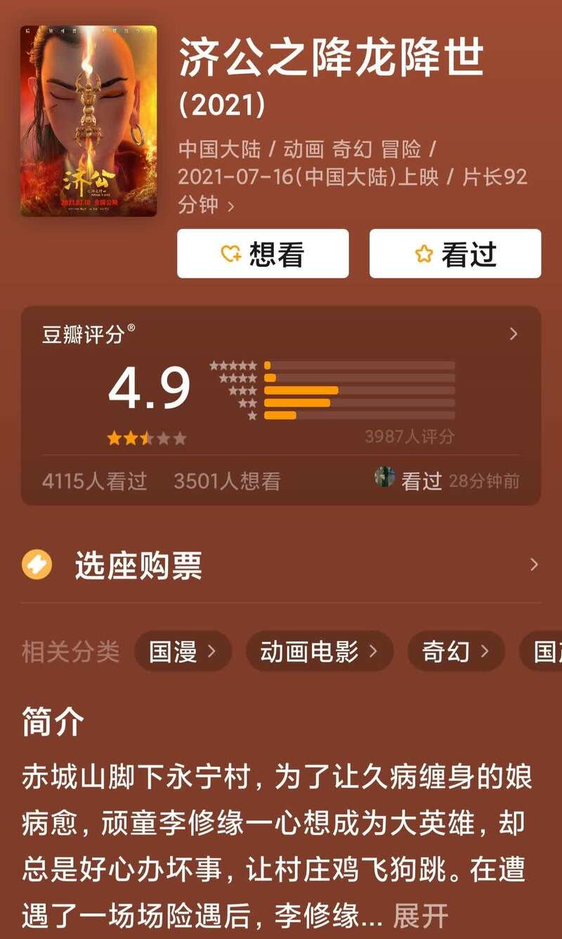 时隔两年的同一时间,《济公之降龙降世》也“降世”了,我们亲眼看到一尊泥胎跌落凡尘,碎成一堆土渣。这部电影豆瓣评分刚解禁,只有惨不忍睹的4.9分。该片上映5天,票房仅3000万。