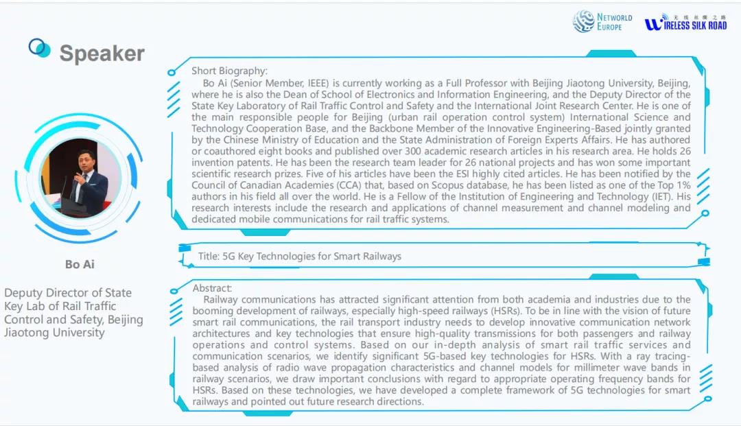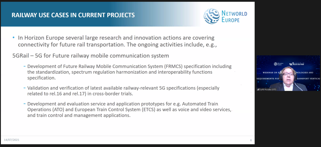 针对智能铁路对移动通信的需求,Networld专家顾问组主席、芬兰国家技术研究中心(VTT)5G及未来网络研究团队负责人Jyrki Huskuo博士介绍了欧洲对于后5G(B5G)和第六代移动通信系统(6G)研究的立场,以及以先进通信技术赋能铁路行业的整体规划。