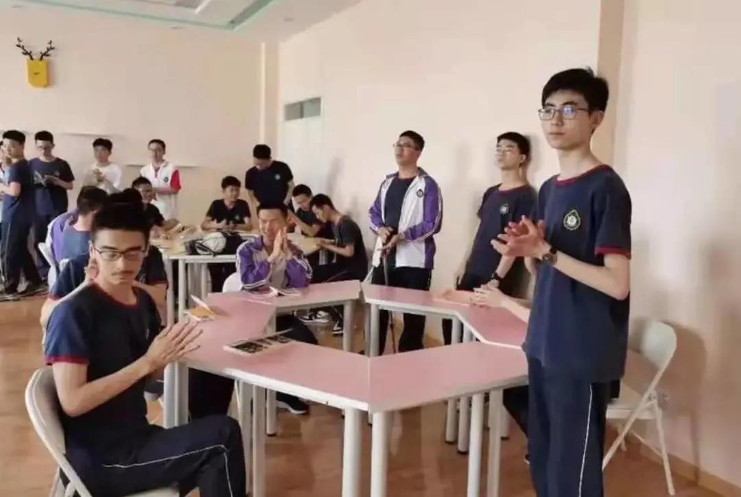图为周桐(右三)返校后参加学校兴趣小组讨论