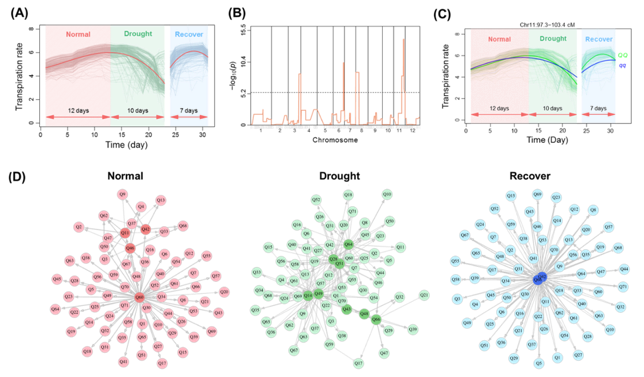 上图为控制渐进式干旱条件下蒸腾速率变化的动态QTLs及其网络。(A)IL群体所有株系蒸腾速率的阶段性变化,其平均向量曲线(红色)由Legendre 函数拟合。(B)通过FPP-FM得到曼哈顿图,表明动态蒸腾速率相关的分子标记的显著性。(C)最显著QTL(11号染色体)上的两个等位位点对蒸腾速率的动态效应比较。(D)处理前正常灌溉、渐进式干旱和复水等三个不同阶段下QTL互作网络。每个网络中的枢纽QTLs用深色高亮显示。