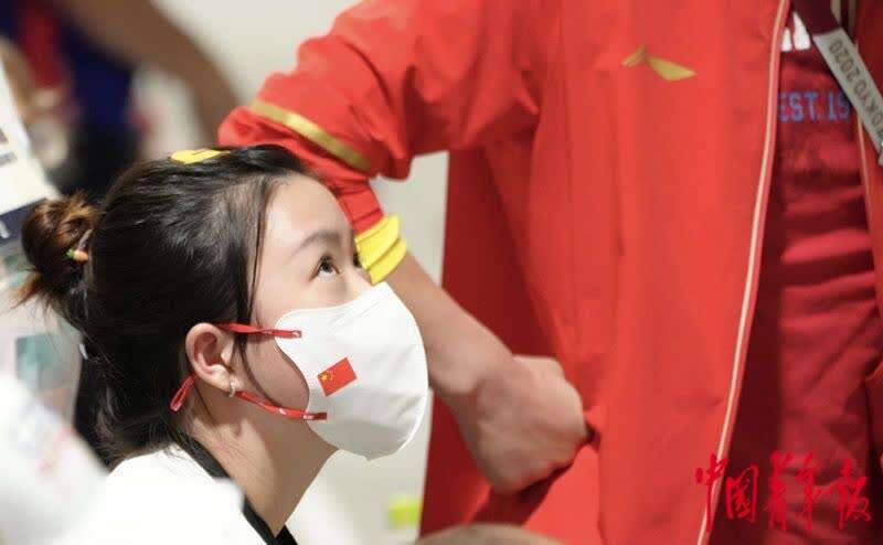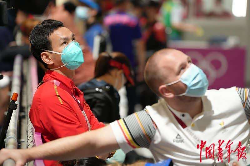 杨倩的教练(左)正在关注成绩 中青报·中青网特派记者刘占坤摄