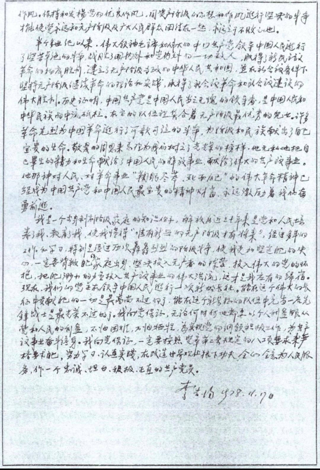 作为一名学生党员,此次有幸能够看到先生的入党志愿书,对先生的家国情怀十分敬佩。先生在1976年年末申请过入党,那时,罪大恶极的“四人帮”刚被粉碎,全国上下一片欢腾。先生在他的入党申请书中回顾了这极不平凡的一年。当周总理、朱德委员和毛主席相继逝世后,先生对国家前途命运充满了担忧;当十恶不赦的“四人帮”一举被粉碎时,先生同全国人民一样激动兴奋。先生的入党志愿书字里行间流露的都是他对国家发展和社会进步的殷切期盼。