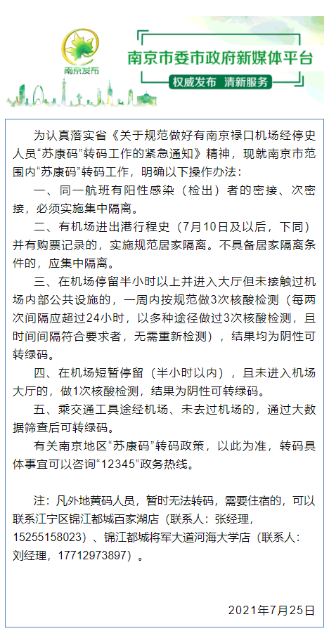 另据此政策相关注释,凡外地黄码人员,暂时无法转码,需要住宿的,可以联系江宁区锦江都城百家湖店(联系人:张经理,15255158023)、锦江都城将军大道河海大学店(联系人:刘经理,17712973897)。