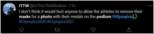 “我不认为允许运动员在领奖台上为拍照摘下口罩,会伤害任何人。”
