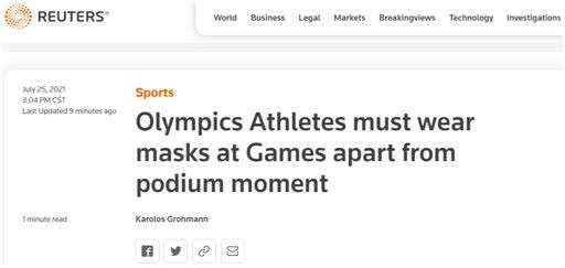 报道称,国际奥委会发言人就此表示,三名运动员摘掉口罩的行为符合新规定,“它允许站在领奖台上(的选手们摘下口罩)最多30秒钟,为(满足)一个(符合)社交距离的拍照留念机会。”