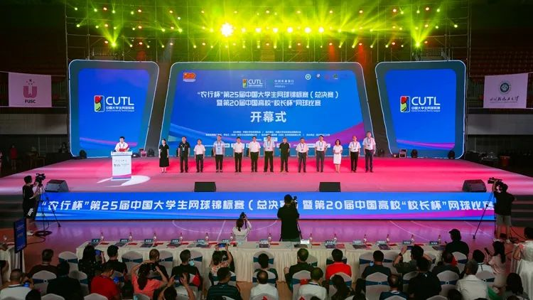 随着背景音乐响起,领导、嘉宾们共同开启赛事:第25届中国大学生网球锦标赛(总决赛)暨第20届中国高校“校长杯”网球比赛正式开幕!伴随灯光变换、会旗招展,各高校校徽图案出现在主屏幕上,现场迎来热烈的掌声。