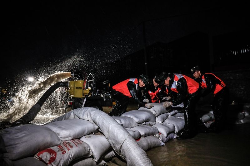 2021年7月26日,受台风“烟花”造成的连日暴雨影响,上海浦东新区南汇新城镇芦潮港社区内河水位急剧上升,造成部分地势低洼的居民区发生水流倒灌。武警上海总队机动第一支队200余名官兵火速前往排险,帮助受灾群众脱离险境。