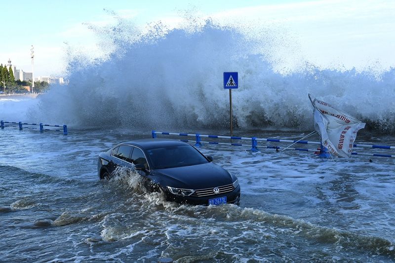 2021年7月25日,在山东省青岛市澳门路,一辆私家车在海浪袭击后抛锚。