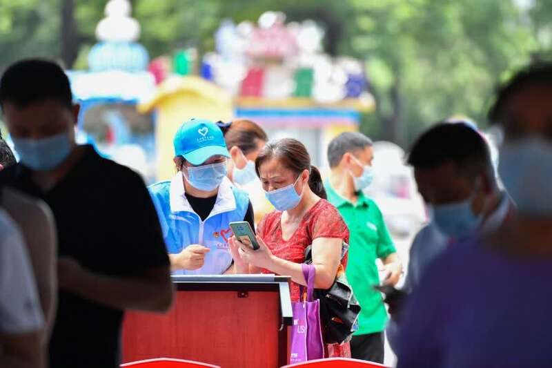 图为长沙市天心区赤岭路街道一个核酸检测点,志愿者引导居民扫码登记信息