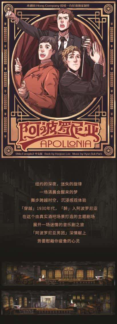 引进改编的《阿波罗尼亚》就设在同名酒吧里,观众拿了饮料后,在吧台位、卡座位、酒箱位前区或后区对号入座。酒吧歌舞演员理查德一来就告诉观众,因为黑手党打压,酒吧明天就要关门,他和迟到的奥斯卡开始准备告别演出,一下就把观众带到了1930年代大萧条大禁酒的纽约。黑手党成员史蒂夫闯来,胁迫两人表演黑手党教父的自传,自己也粉墨登场。三个性格迥异各怀心事的男人穿梭在微醺的顾客中,展开了令人啼笑皆非、戏中戏交叠的歌舞演出。