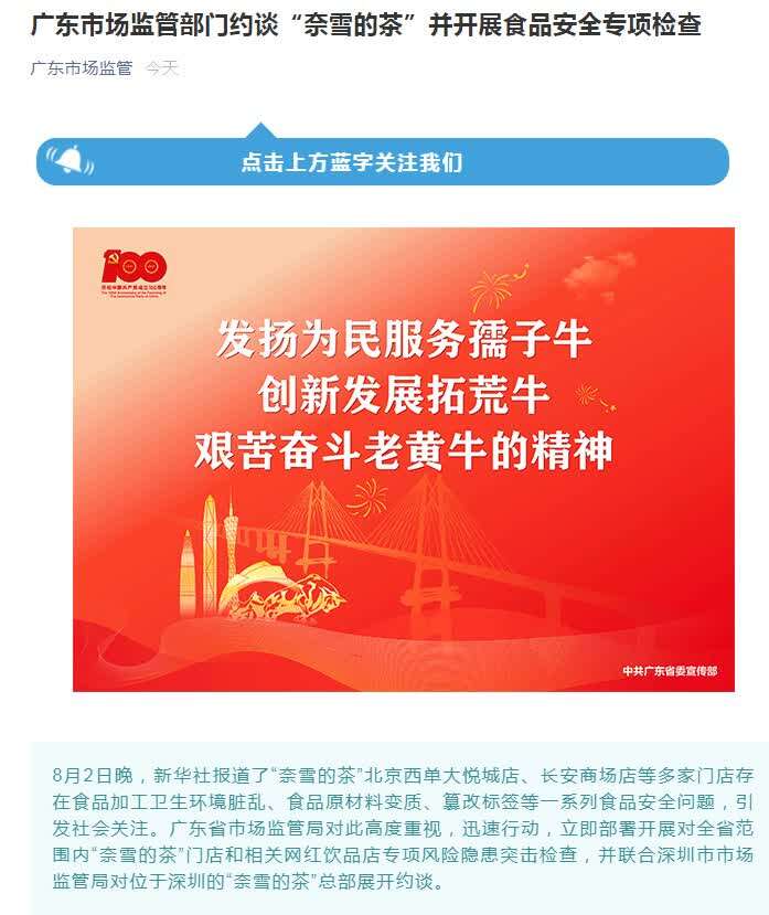 据广东省市场监督管理局微信号消息,广东省市场监管局对媒体曝光问题高度重视,迅速行动,立即部署开展对全省范围内“奈雪的茶”门店和相关网红饮品店专项风险隐患突击检查,并联合深圳市市场监管局对位于深圳的“奈雪的茶”总部展开约谈。