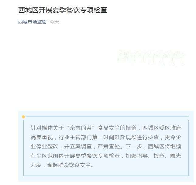 据北京市西城区市场监督管理局微信号消息,针对媒体关于“奈雪的茶”食品安全的报道,西城区委区政府高度重视,行业主管部门第一时间赶赴现场进行检查,责令企业停业整改,并立案调查,严肃查处。下一步,西城区将继续在全区范围内开展夏季餐饮专项检查,加强指导、检查、曝光力度,确保群众饮食安全。