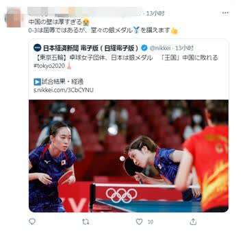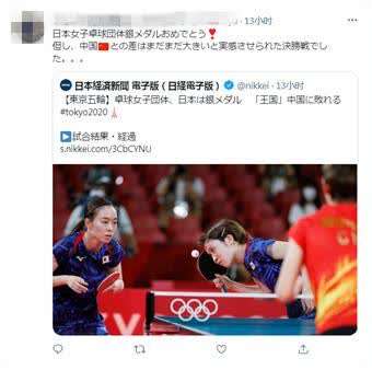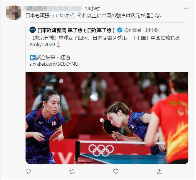 比赛结束后,日本网友纷纷发表评论。在《日本经济新闻》电子版以题为“乒乓女团赛,日本获得银牌不敌‘乒乓王国’中国”的报道下,针对中日选手水平差距,日本网友评论道,“虽然日本队也非常努力了,但是再往上的话跟中国的水平就不在一个次元了。”
