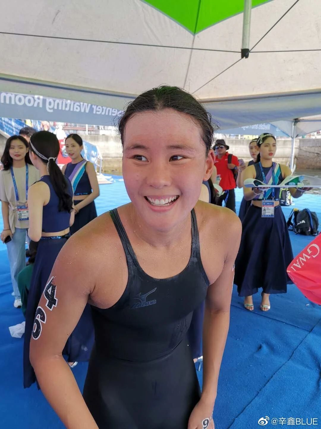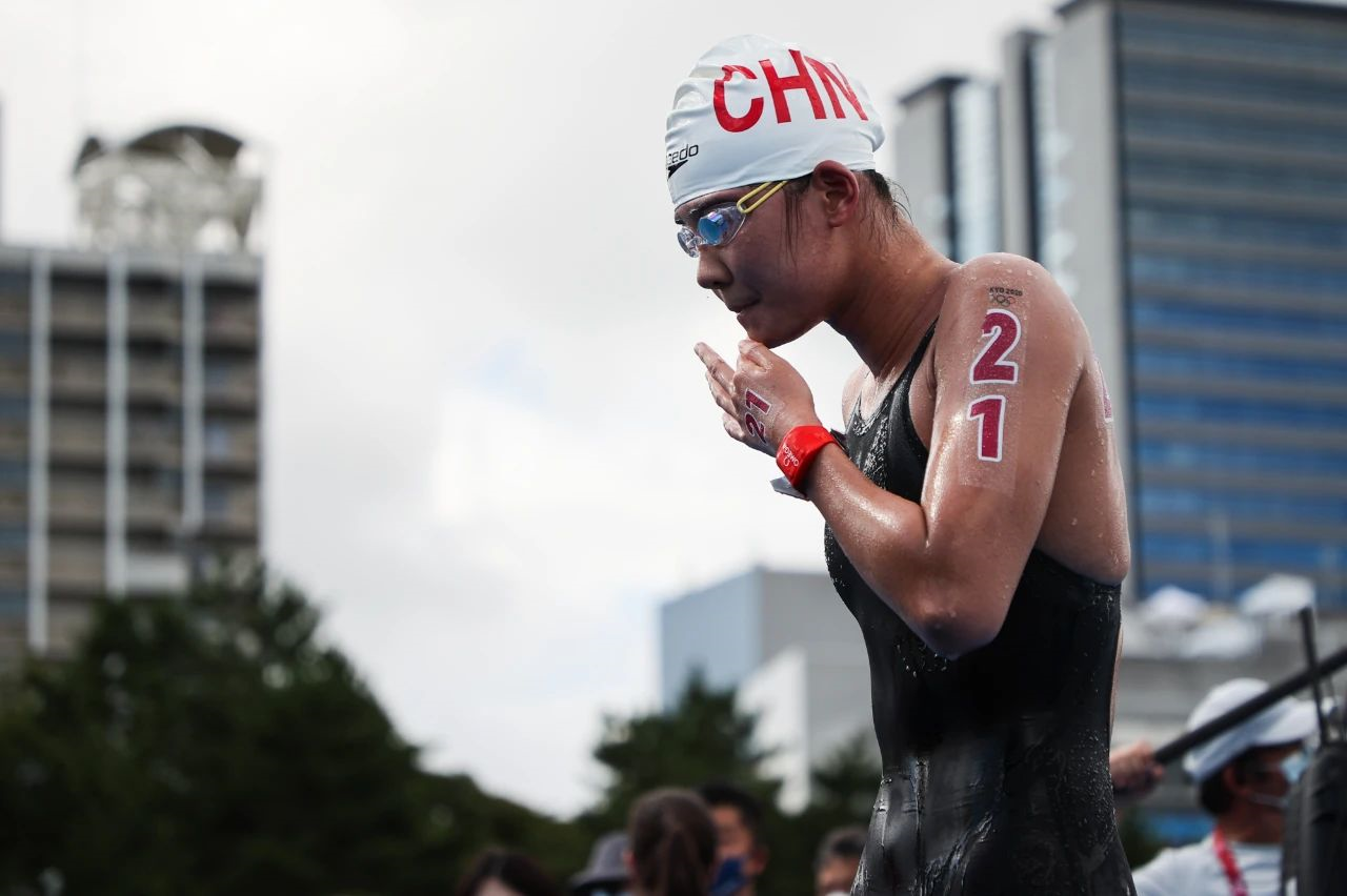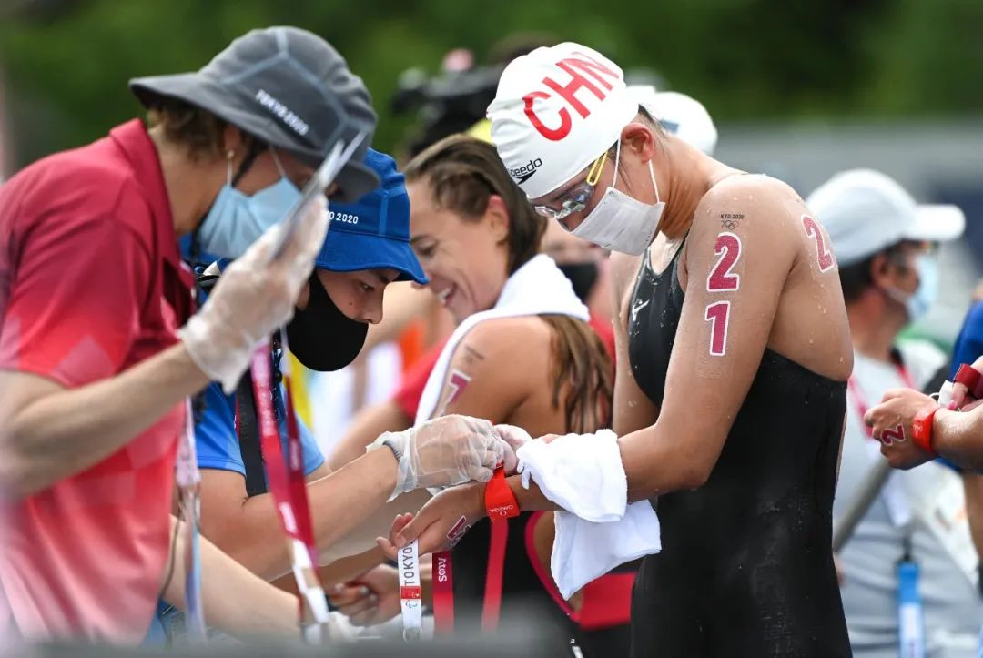 2021年8月3日,辛鑫在东京湾做赛前训练时,上岸第一件事就是麻烦队里的工作人员帮她清理背上的虫子。