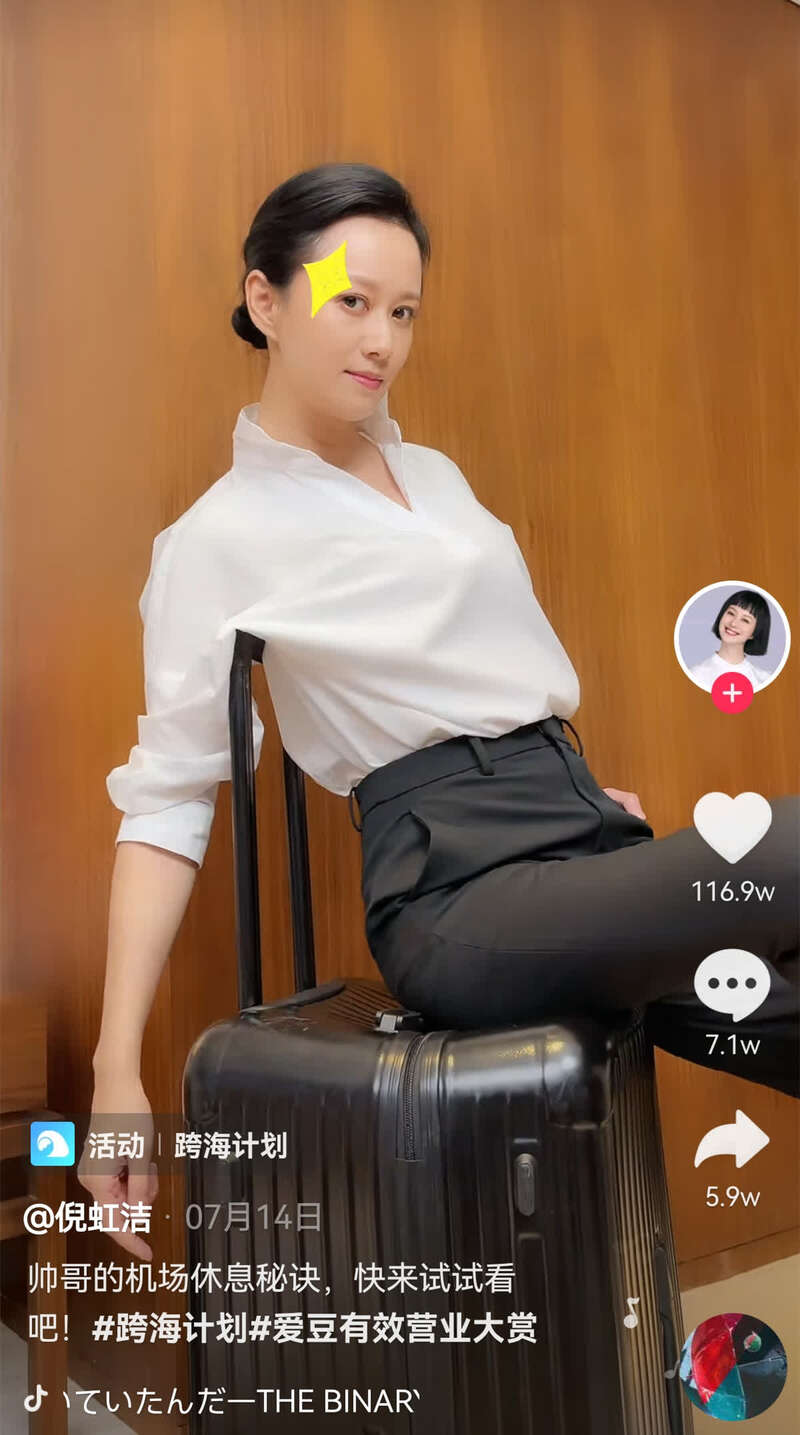 她在抖音上发一些有梗的短视频,用上海话教学“在机场怎么坐行李箱更有腔调”,拍连换几套紧身礼服做家务,像是《致命女人》的女主角……下面的高赞评论夸她,《武林外传》都过去15年了,无双像是没变过,看起来还和20多岁时一样。