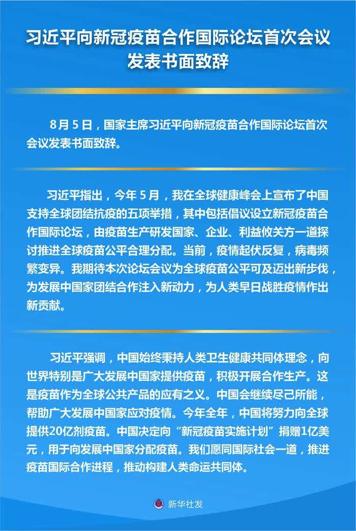 新华网北京8月7日电(李雪梅)8月5日,国家主席习近平向新冠疫苗合作国际论坛首次会议发表书面致辞,宣布两项重要举措:今年全年,中国将努力向全球提供20亿剂疫苗;中国决定向“新冠疫苗实施计划”捐赠1亿美元,用于向发展中国家分配疫苗。