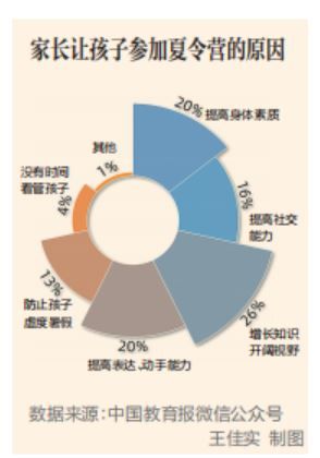 近日,中国教育报微信公众号就“暑期夏令营”话题开展了专项调查。在近2000名参与调查的家长中,有近80%的家长想给孩子报夏令营,其中三分之一的家长愿意给孩子报名素质拓展类夏令营,其他家长则选择了科学、艺术等不同类型的夏令营;有近30%的家长希望孩子能从中增长知识,开阔视野。“现在的孩子们都懂得多、见识广,暑假正好有时间,可以给孩子报个夏令营。”北京一名小学四年级学生家长说。